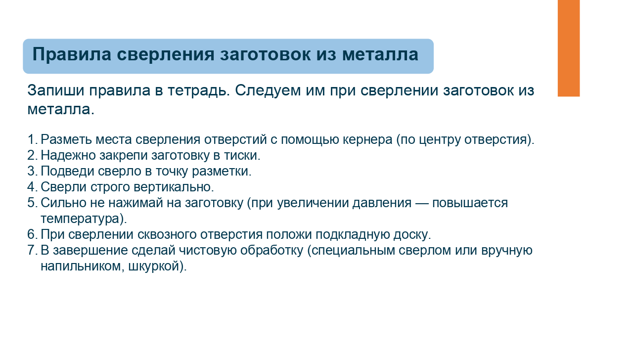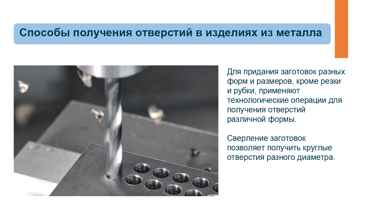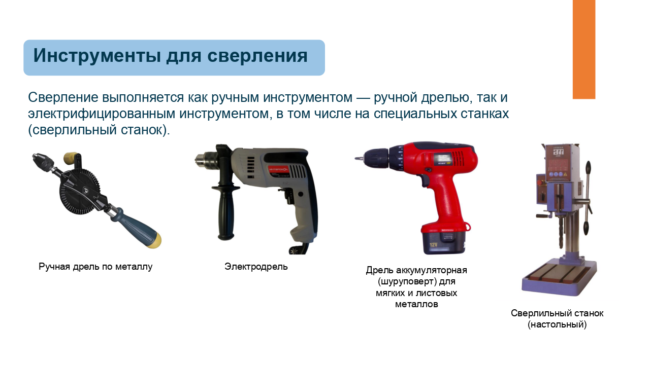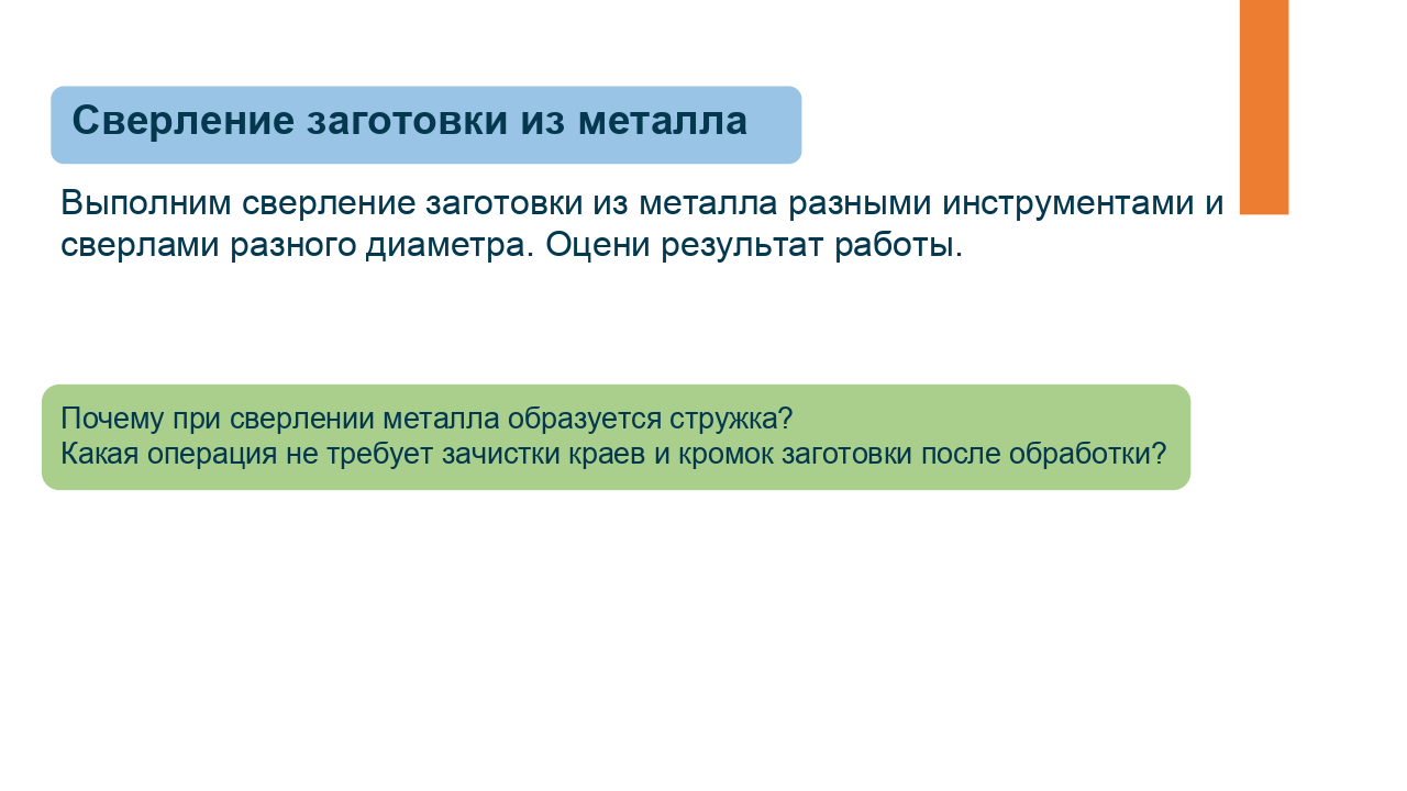 Здесь доступен предпросмотр презентации из одного урока по предмету «Технология» для 6 класса по теме «Технологии получения отверстий в заготовках из металла. Сверление». Комбинированный урок. На уроке предусмотрено использование следующих типов электронных образовательных материалов: «Галерея изображений (группа изображений по одной тематике)», «Изображение или фото», «Инструкция по выполнению практической работы», «Кейсы по работе с информацией».