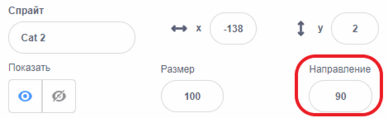Направление, в которое смотрит спрайт, можно увидеть в свойствах спрайта. Нажав на окошко с направлением, его можно принудительно изменить, не используя команды.