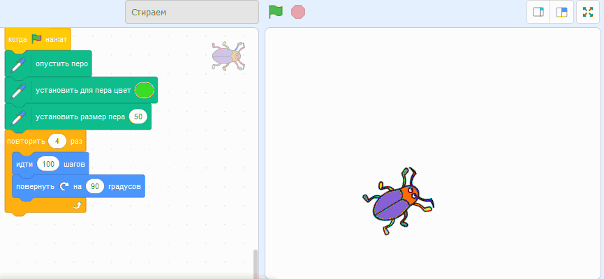 «Стереть всё». Эта команда очищает сцену