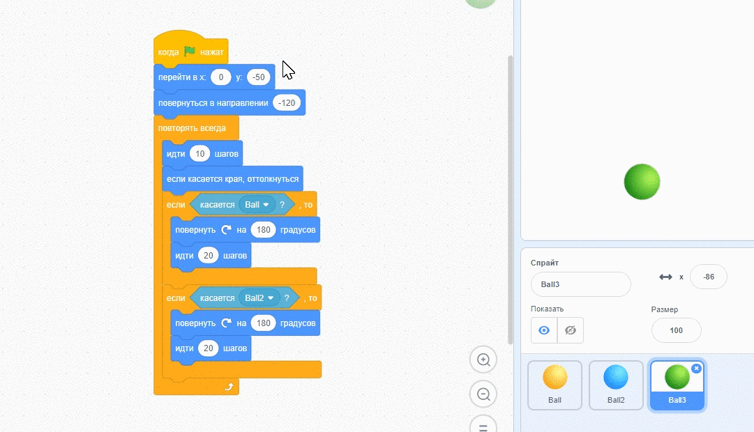 Скрипты у мячей очень похожи: они отличаются только указанием спрайтов, с которыми они сталкиваются. Если собрать скрипт для одного мяча, то его можно использовать как заготовку для других мячей. Для этого перенеси скрипт на изображение спрайта, как показано на анимации.